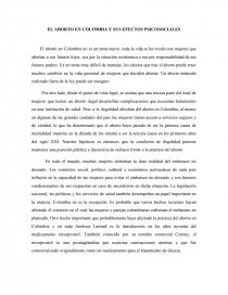 El aborto en Colombia no es un tema nuevo, toda la vida se ha vivido con mujeres que abortan a sus futuros hijos, sea por la situación económica o sea por responsabilidad de sus futuros padres. Es un tema muy difícil de manejar, los efectos que trae el aborto puede traer muchos cambios en la vida personal de mujeres que deciden abortar. Un aborto inducido realizado fuera de la ley puede ser inseguro.