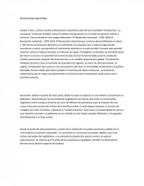 Ensayo crítico: ¿Cómo cambió la Revolución industrial la vida de la humanidad? Introducción: La revolución industrial se define como el cambio revolucionario en el modo de producir bienes y servicios. Esta se divide en tres etapas diferentes: 1ª Revolución industrial - 1760-1830 2ª Revolución industrial - 1870-1914 3ª Revolución industrial que continua desarrollándose en pleno s. XXI Dichas revoluciones afectaron no solamente a la industria sino a toda la organización económica y social, que permitió el crecimiento económico a nivel mundial. Durante este periodo inventos como la máquina de telar, la máquina de vapor, el telégrafo, el petróleo, la transformación del hierro en acero y la aparición de la electricidad, fueron fundamentales para el cambio de modelo productivo, pasando del autoconsumo a un modelo empresarial y global. Previamente múltiples factores como el aumento de la producción agraria, la mano de obra abundante, el capital, la expansión del comercio, las innovaciones técnicas, la mentalidad empresarial y la política favorable, fueron vitales para hacer posible el comienzo de dicha revolución. La revolución industrial ha sido el mayor acontecimiento en la historia de la humanidad, tanto social como económicamente.