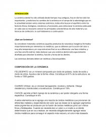 Se consideran materiales cerámicos aquellos productos de naturaleza inorgánica formados mayoritariamente por elementos no metálicos, que se obtienen por la acción del calor a muy alta temperatura y en cuya estructura final se va a diferenciar una fase cristalina, y una fase amorfa (vidrio). Cabe destacar que una cerámica dental está especialmente diseñada para devolver la estética, función y forma de los dientes.
